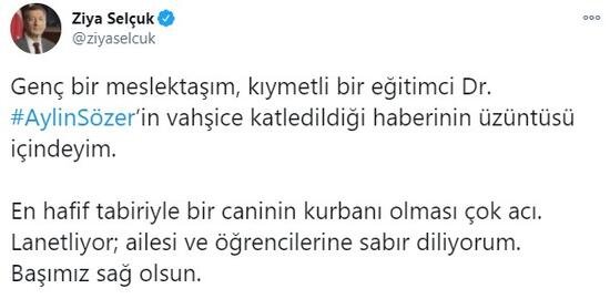 Bakan Selçuk açıklamasında şu ifadelere yer verildi; Genç bir meslektaşım, kıymetli bir eğitimci Dr. #AylinSözer’in vahşice katledildiği …