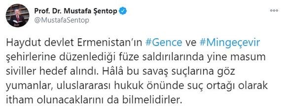 TBMM Başkanı Mustafa Şentop, Twitter hesabı üzerinden yaptığı açıklamada, “haydut devlet Ermenistan’ın Gence ve Mingeçevir şehirlerine düzenlediği füze saldırılarında yine masum sivillerin hedef alındığını” belirtti.