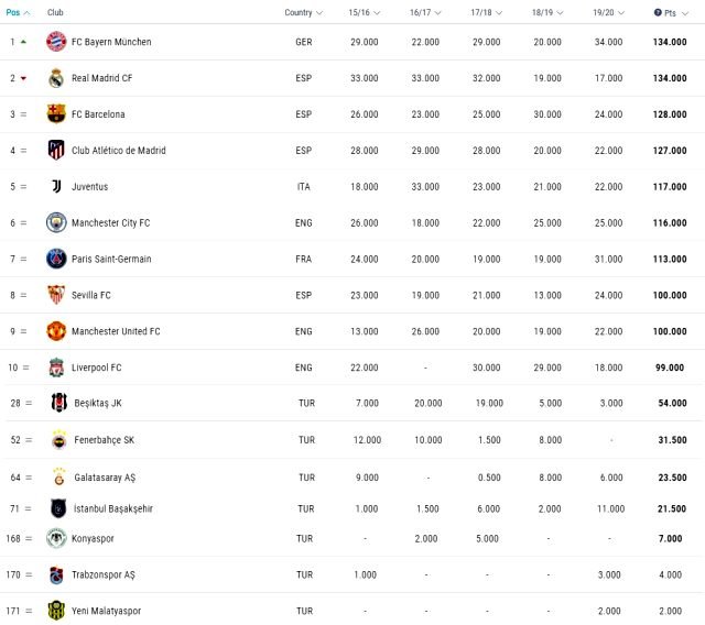 Geçen sezon Avrupa’da hiç puan elde edemeyen Fenerbahçe toplamda kazandığı 31 bin 500 puanla 52. sırada yer alırken, Şampiyonlar Ligi’nde kötü bir yıl geçiren Galatasaray 23 bin 500 puanla 64. sırada bulundu.