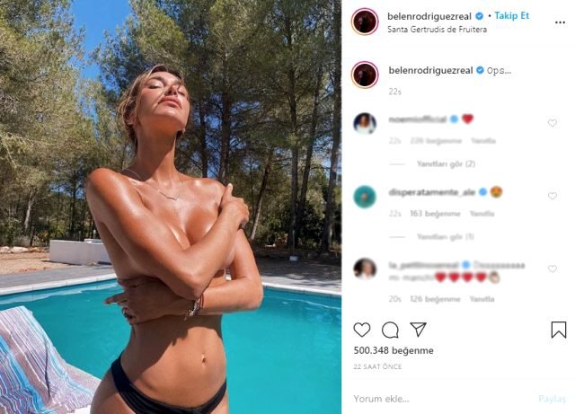 Moto GP pilotu Andrea Iannone‘nin model sevgilisi Belen Rodriguez, sosyal medya hesabından havuz kenarındaki üstsüz pozunu takipçilerinin beğenisine sundu.