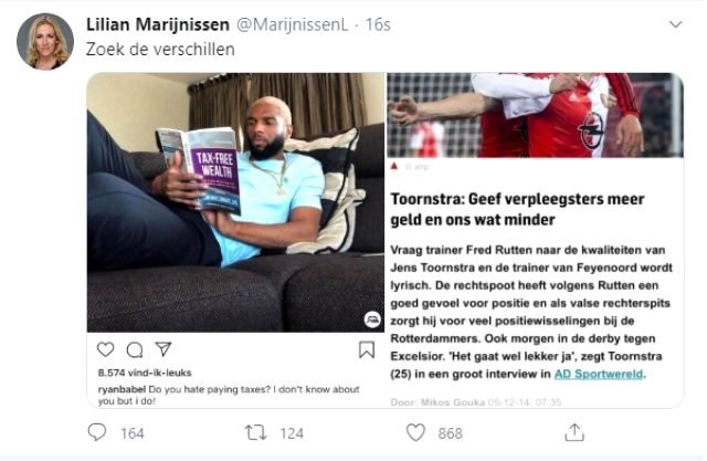 Elindeki ‘Vergisiz Zenginlik’ kitabıyla poz veren Babel fotoğrafını sosyal medyadan paylaştı. Feyenoordlu futbolcu Jens Toornstra ise, “Bence hemşireler çok daha fazla kazanmalı, biz futbolcular ise çok daha az” şeklinde yaptığı yorumla manşete çıktı.
