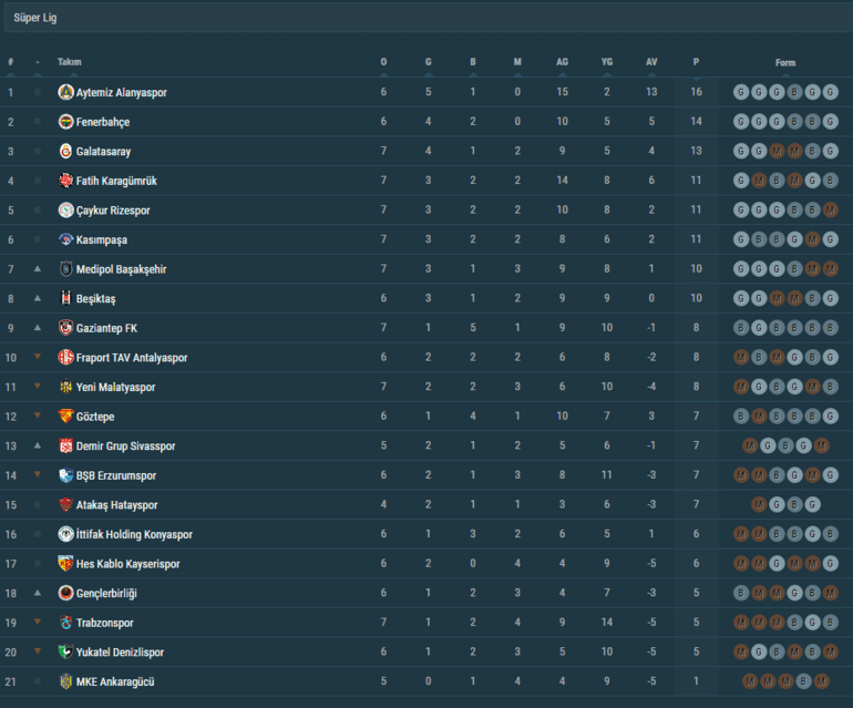 Süper Lig 7. haftanın ardından oluşan puan durumu ve günün maçları