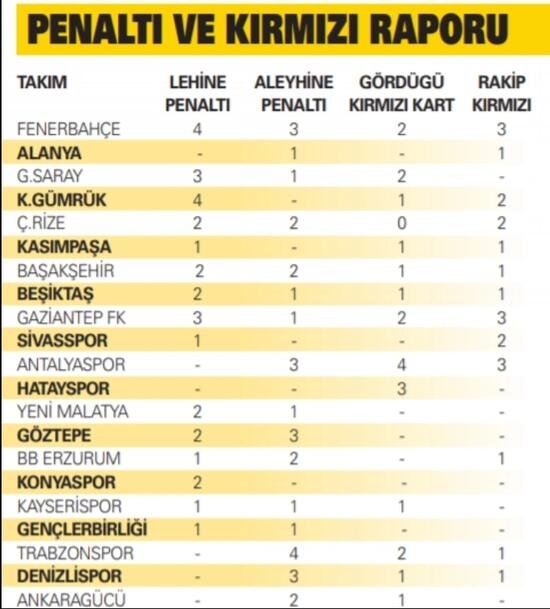 Ligin en agresif ekibi olarak Antalyaspor öne çıkıyor. Akdeniz temsilcisi, bu haftaya kadar tam 4 kez kırmızı kart gördü. Trabzonspor ise aleyhine çalınan penaltılarda rakipsiz! Bordo-Mavililer, rakip ceza alanında hiç beyaz noktayı göremedi. Ancak rakipleri tam 4 kez penaltı kullandı. Bordo-Mavili takım, son yılların en kötü istatistiğine böylece imza attı. Beşiktaş ise lehte ve aleyhte kararlarda çok daha dengeli gözüktü.