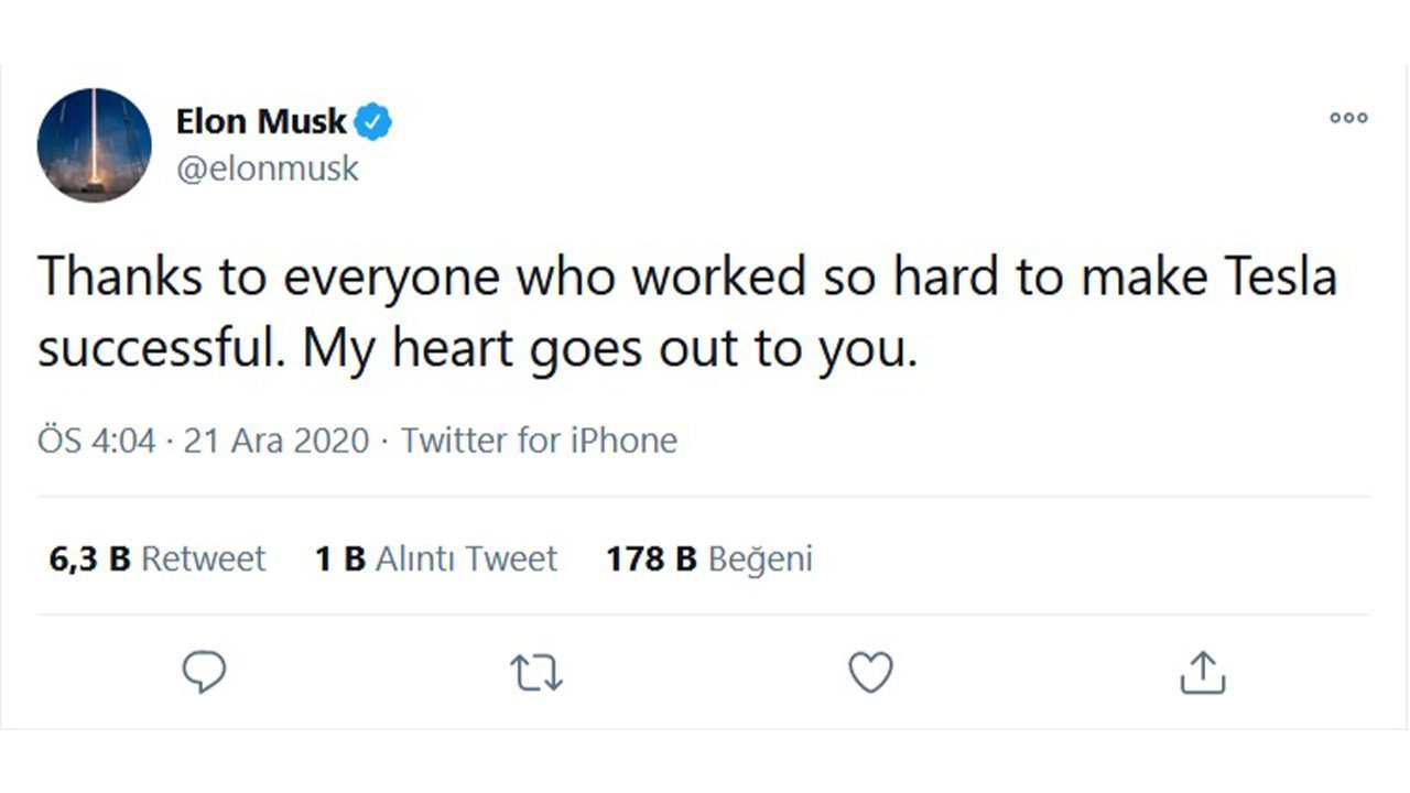 Elon Musk, bugün Twitter hesabından yaptığı paylaşımda “Tesla’nın başarılı olması için sıkı şekilde çalışan herkese teşekkürler. Kalbim sizinle.” ifadelerini kullandı. Bu teşekkür Tweetinin sebebi, Tesla’nın Standard & Poor tarafından yapılan S&P 500 borsa endeksine dâhil olmasıydı.