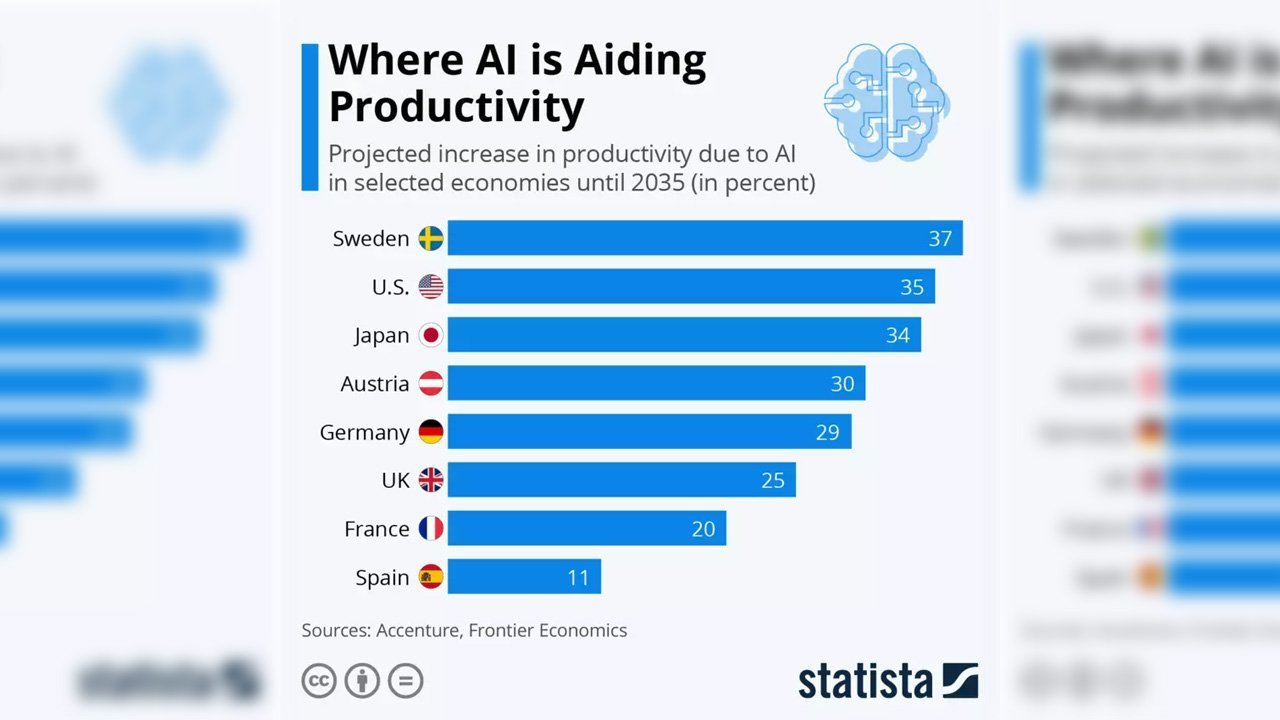 Accenture ve Frontier Economics tarafından gerçekleştirilen bir araştırmaya göre, yapay zekâdan iş verimliliği açısından en yüksek oranda etkilenecek ülke, akla ilk gelen ABD ya da Japonya değil, İskandinav ülkesi İsveç olacak. Yapılan çalışmaya göre yapay zekâ, İsveç’teki iş verimliliğini 2035 yılına kadar %37 oranında artıracak.